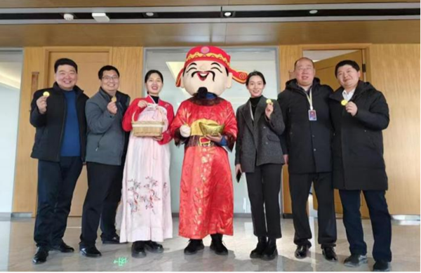 復(fù)工首日,鄭州總部園與海南鴻寶總部“夢(mèng)幻聯(lián)動(dòng)”,組織開展“財(cái)神送金”慶?;顒?dòng)??偛繄@物業(yè)服務(wù)中心的“財(cái)神爺”與“玉兔仙子”手持鎏金元寶,為鴻寶家人送上金幣巧克力,寓意開門見喜、好運(yùn)連連;海南鴻寶團(tuán)隊(duì)則帶領(lǐng)“財(cái)神爺”在總部樓宇進(jìn)行新春拜訪并為商戶送上好運(yùn)金幣,祝愿每一戶商戶財(cái)運(yùn)亨通、事業(yè)興旺。